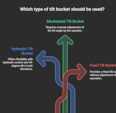 A tilt bucket can turn side to side, on a line with the workpiece, thus enabling the operator to accomplish precise grading, digging, and material handling tasks, while a conventional bucket is only vertically movable.