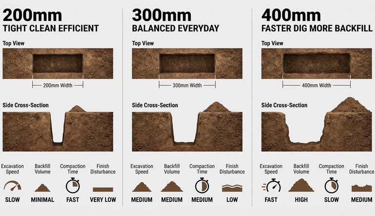 A 400mm trench digs faster per pass, but you pay for the width later. More spoil means more backfill. More backfill means more compaction. More compaction means more time. If the ground is rocky or the route crosses finished areas, the extra width can become expensive.